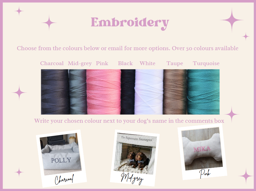 Please detail in the personalisation box your pup's name and your preferred thread colour.
